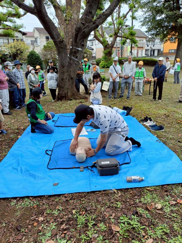 ・心肺停止者の発見を想定し、マネキンを用いた心肺蘇生とAEDの使用方法の実技体験。(山岡防災士による指導)