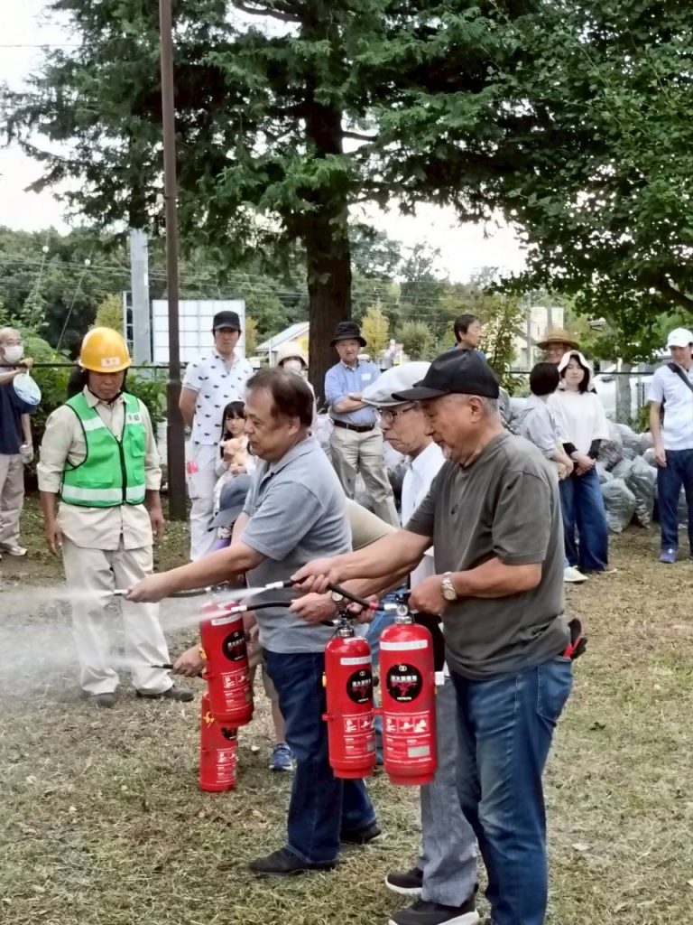 ・消火器の説明、使い方、操作方法を説明し、訓練用消火器を用いた初期消火の実技体験。 (自治会役員による指導)