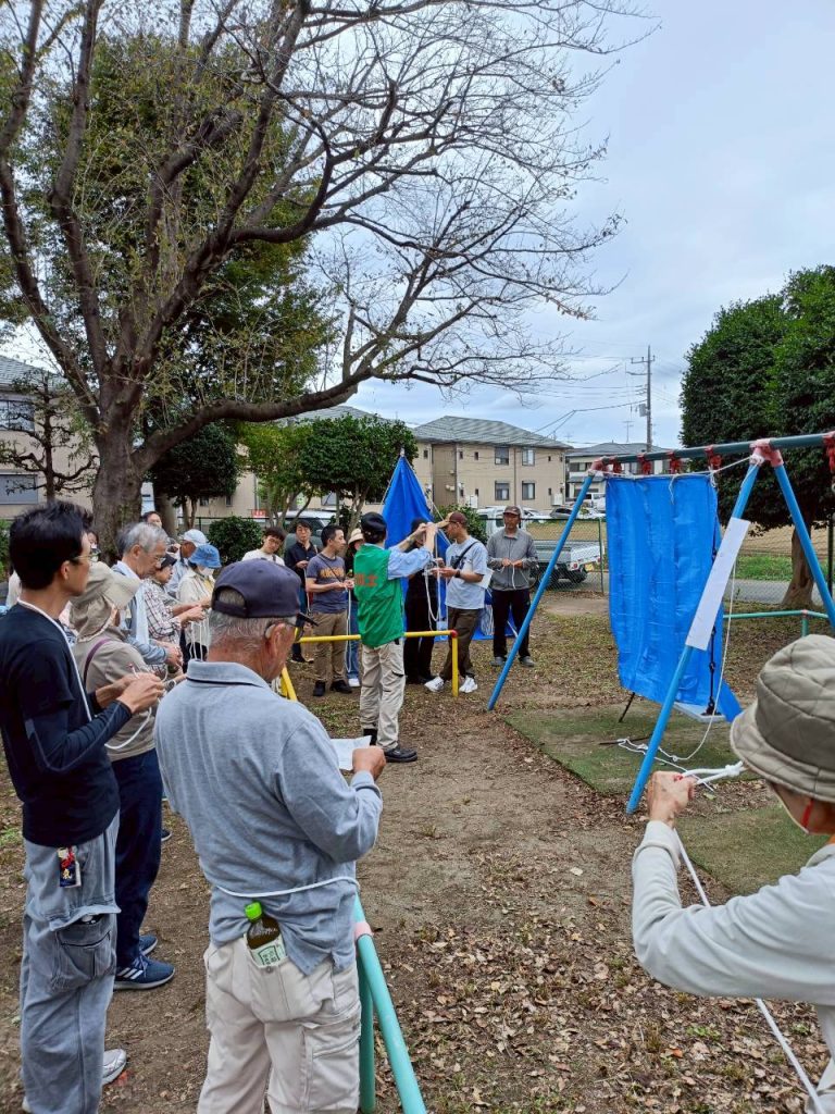 ・ロープワーク(本結び・巻結び・鎧結び)の実習とそれを利用した三角テント、カーテンの紹介。(石田防災士による指導)